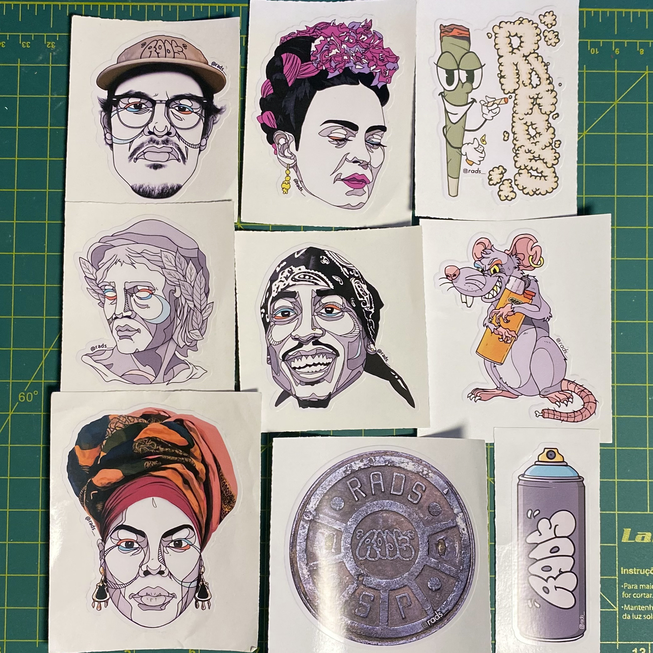 Stickers: rads simley, 2Pac, Queen Latifah, Frida Kahlo, Cash Rules, rads spray can, rads smoke, lighter rat, rads sewer.